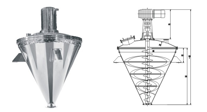 立式螺帶混合機(jī)由傳動部分(fēn)、螺杆攪拌器(qì)、倒錐形桶體(tǐ)組成。